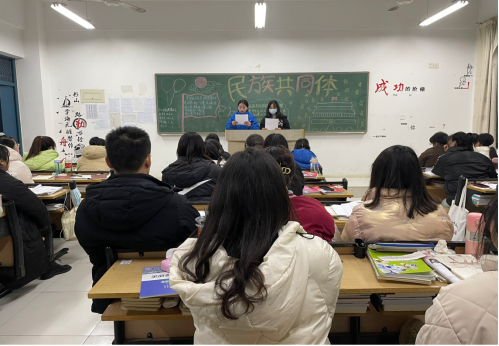 首先,各班班长为全体同学介绍了本次活动的主题和流程。接着,团支书利用内容丰富的课件为全体同学讲解了什么是中华民族共同体,讲述了它的意义和如何形成和发展。然后,同学们踊跃分享自己对于中华民族共同体的感想。最后,各班辅导员对本次班会好的进行总结,鼓励全体同学积极培养中华民族共同体意识,教育同学们要高举中华民族大团结旗帜,铸牢中华民族共同体意识,像爱护自己的眼睛一样一样爱护民族团结,像珍视自己的生命一样珍视民族团结,像石榴籽一样紧紧抱在一起,相互尊重、相互包容、相互欣赏、相互学习、相互帮助。