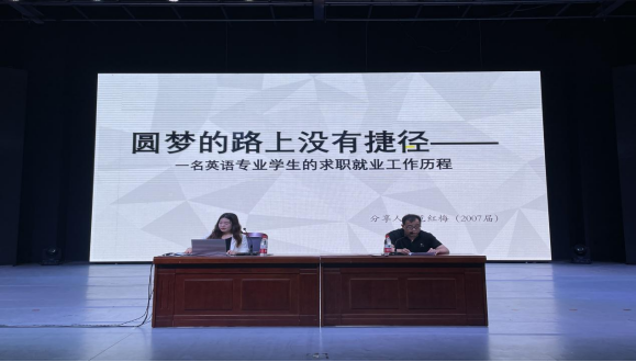 为更好地帮助在校老员工了解英语专业的发展前景和就业方向,指导员工做好学习、就业规划。6月6日下午,304永利集团在学校图书馆报告厅举行了一场别开生面的优秀员工报告会。本次报告会以“圆梦路上没有捷径——一名英语专业员工的求职就业工作历程”为主题,邀请公司2007届优秀毕业生范红梅回校进行经验分享。报告会由公司办公室主任谢福良主持。