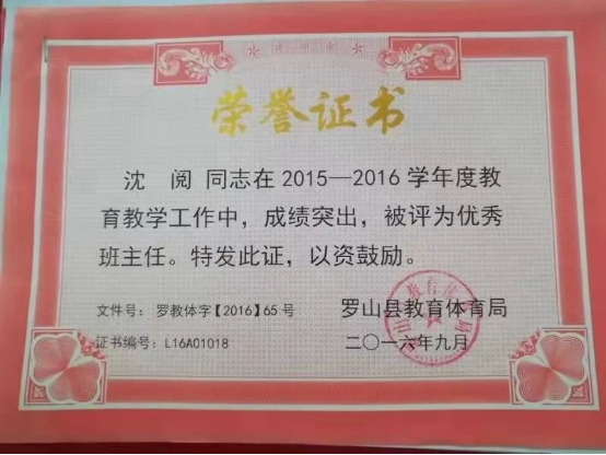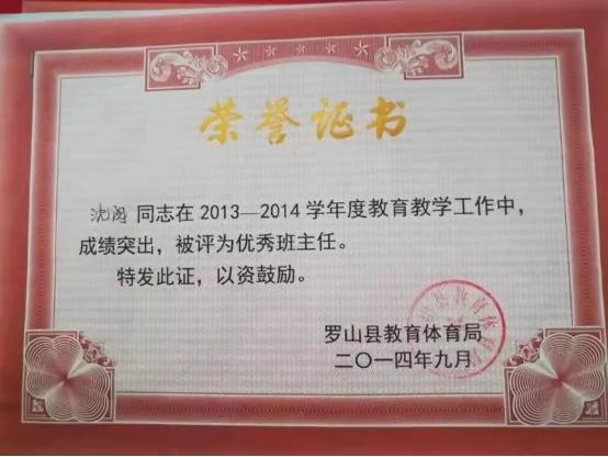 沈阅,304永利集团2003级英语教育专业员工,自2006年毕业至今,十三年来,他一步一个脚印,先后工作于罗山县莽张初中、莽张高中、罗山县高级中学,连续五年担任省级示范高中毕业班班主任,为985、211院校输送100多名新生。