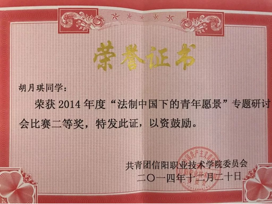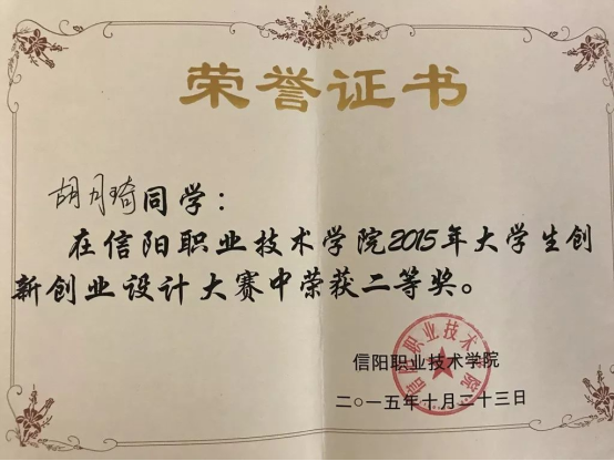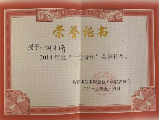 大学三年中,胡月琦积极参加公司各种技能活动,参与各种比赛:2014年获得304永利集团“十佳青年”荣誉称号;2014年度第五届职业技能大赛活动中,荣获二等奖;2014年度“法制中国下的青年愿景”专题研讨会比赛二等奖;2014年度“第二届老员工社会实践演讲比赛”中荣获三等奖;2015年度,老员工创新创业设计大赛中荣获二等奖;2016年5月,加入中国共产党。